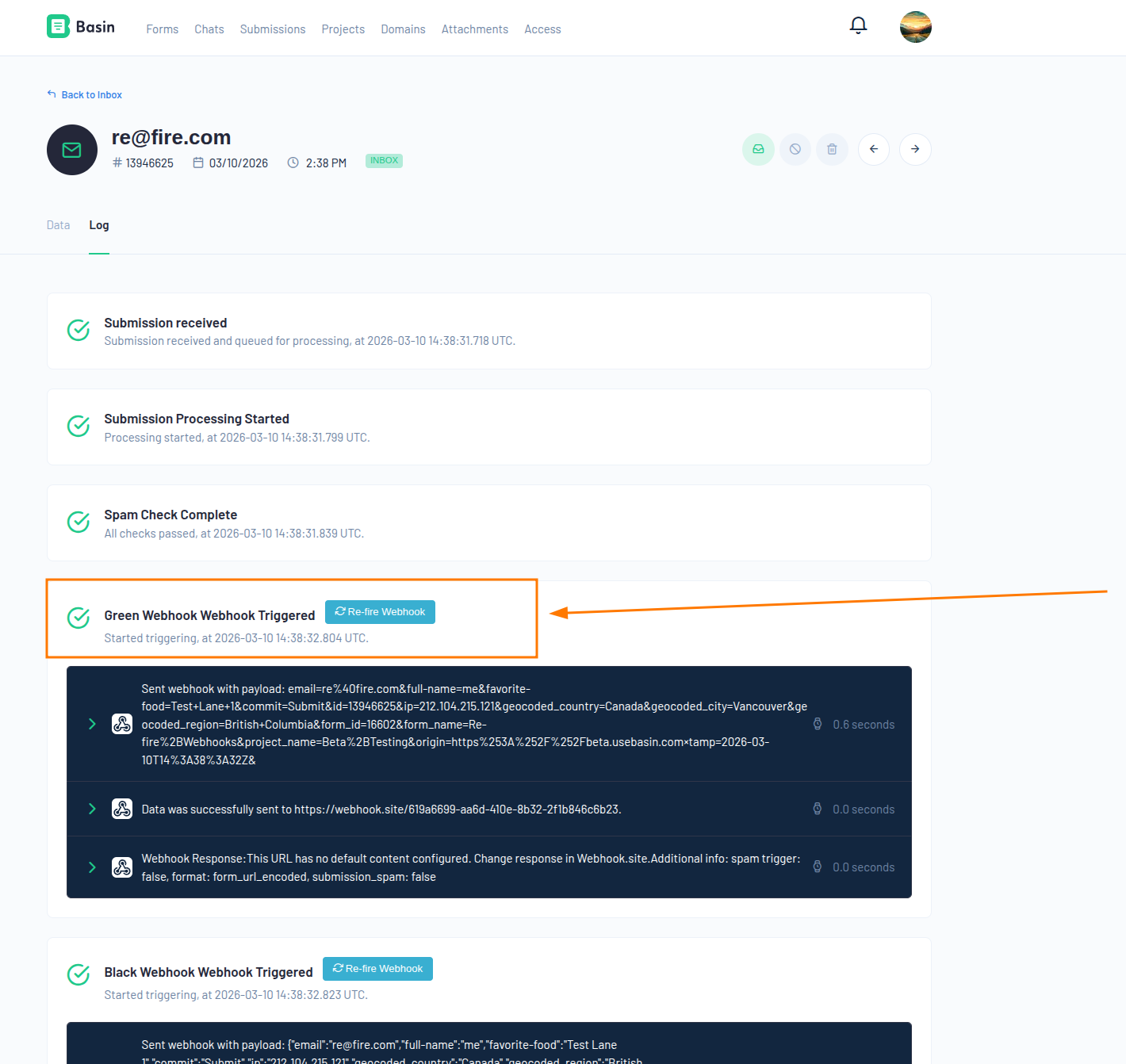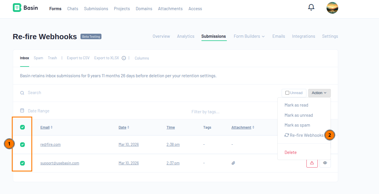 If a webhook fails or you need to resend submission data, Basin lets you re-fire webhooks manually without resubmitting the form.